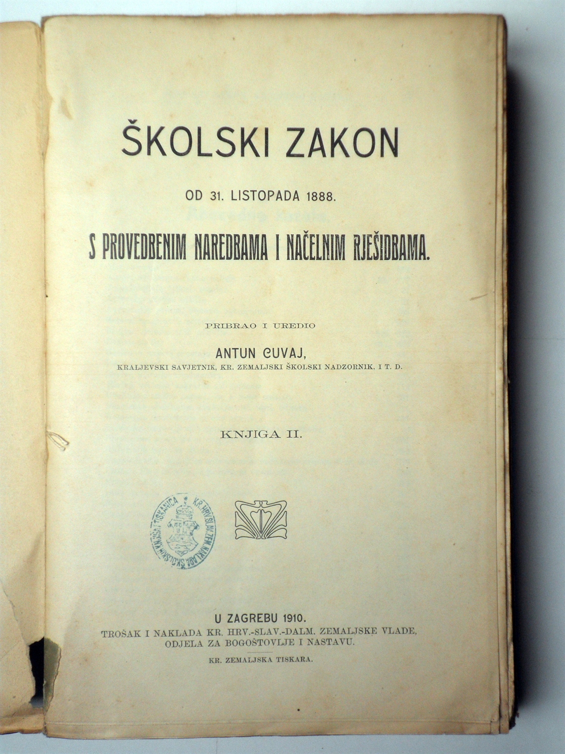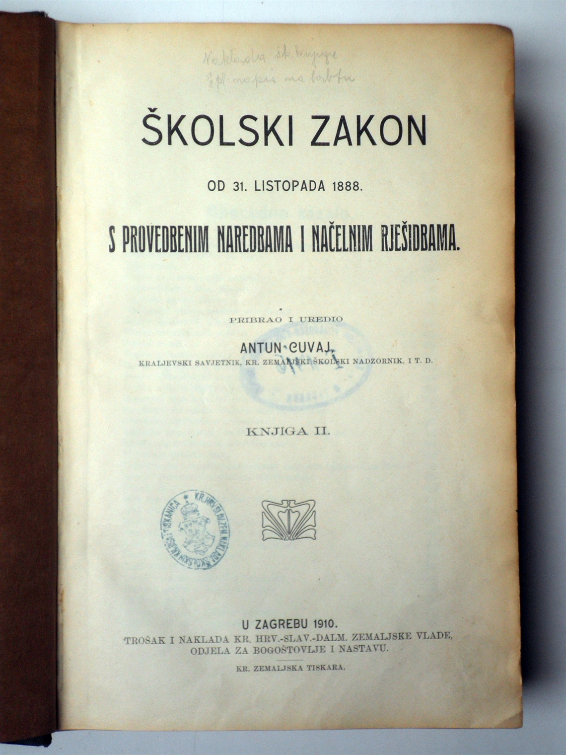Školski zakon od 31. listopada 1888. s provedbenim naredbama i načelnim rješidbama. Knjiga II. / pribrao i uredio Antun Cuvaj