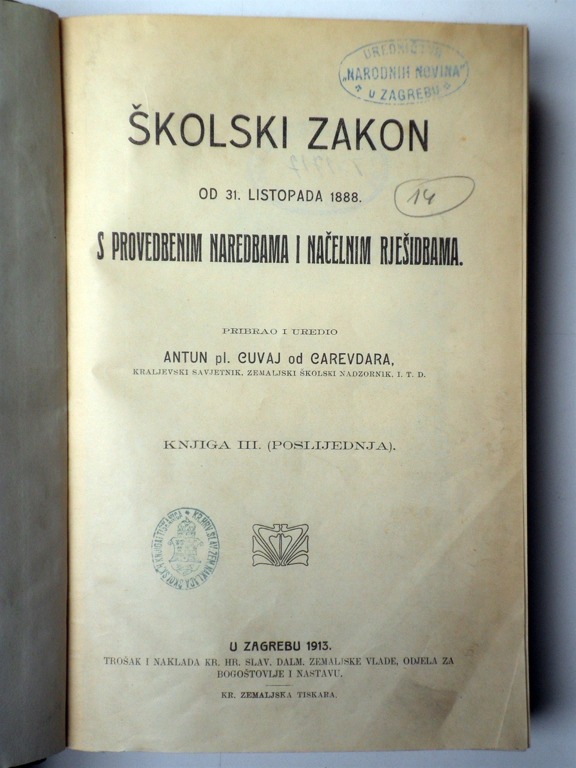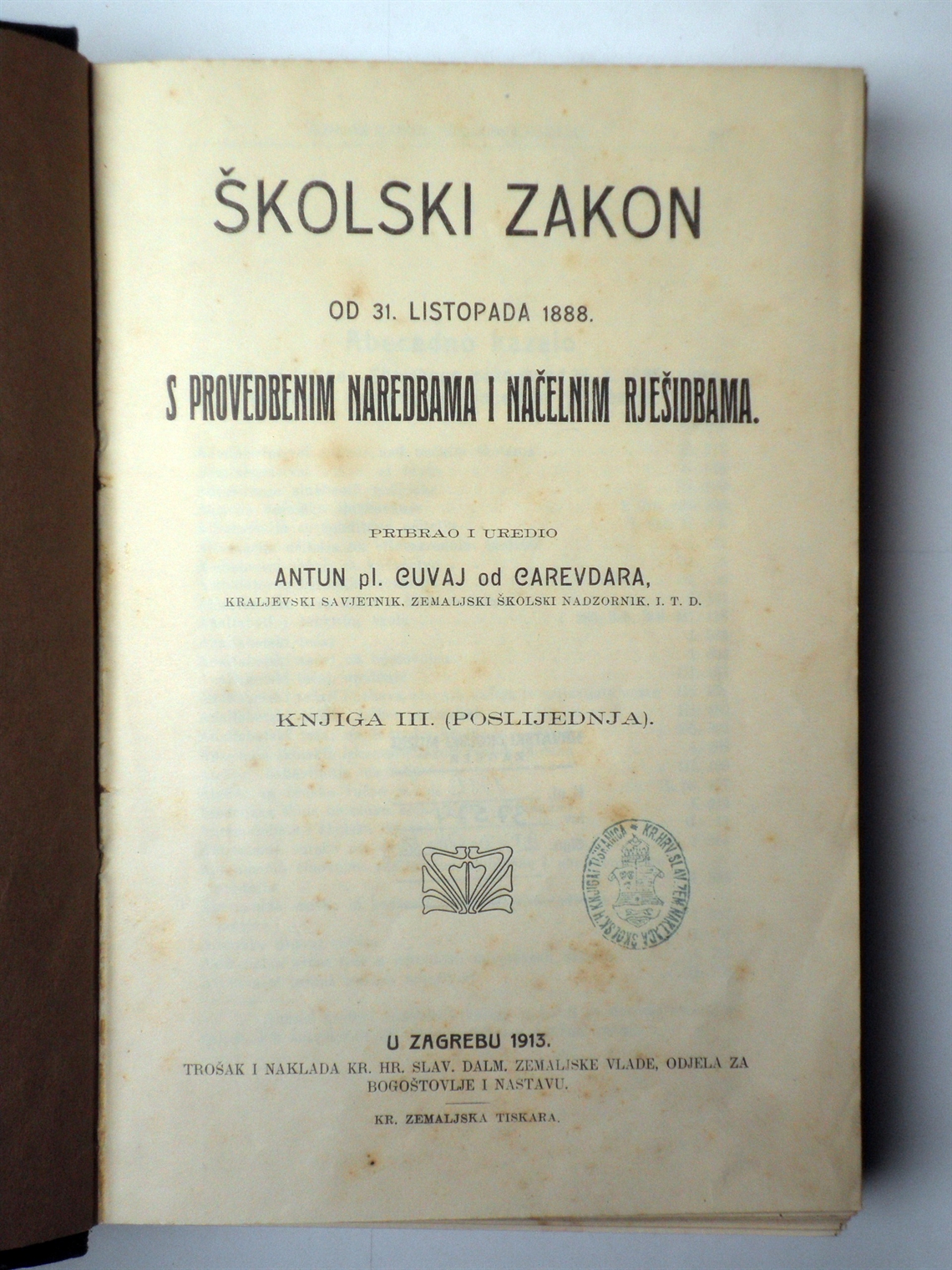 Školski zakon od 31. listopada 1888. s provedbenim naredbama i načelnim rješidbama. Knjiga III. (posljednja) / pribrao i uredio Antun Cuvaj