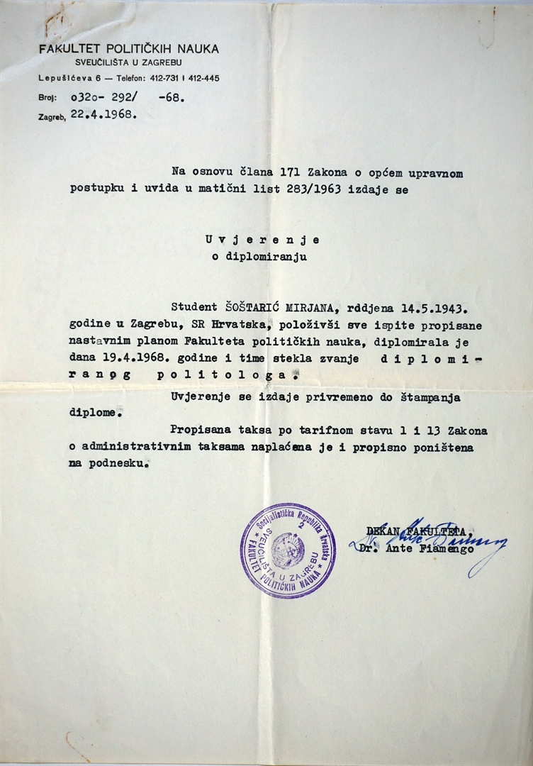 Domini, Mirjana (rođ. Šoštarić). 1926 / 1981. 39 kom 1. Domini, Mirjana (rođ. Šoštarić). Školski i osobni dokumenti. 1949 / 1981. 31 kom 2. Šoštarić, Antonija (rođ. Kopavnik). Školski i osobni dokumenti. 1926 / 1958. 8 kom Prilog: posjetnica