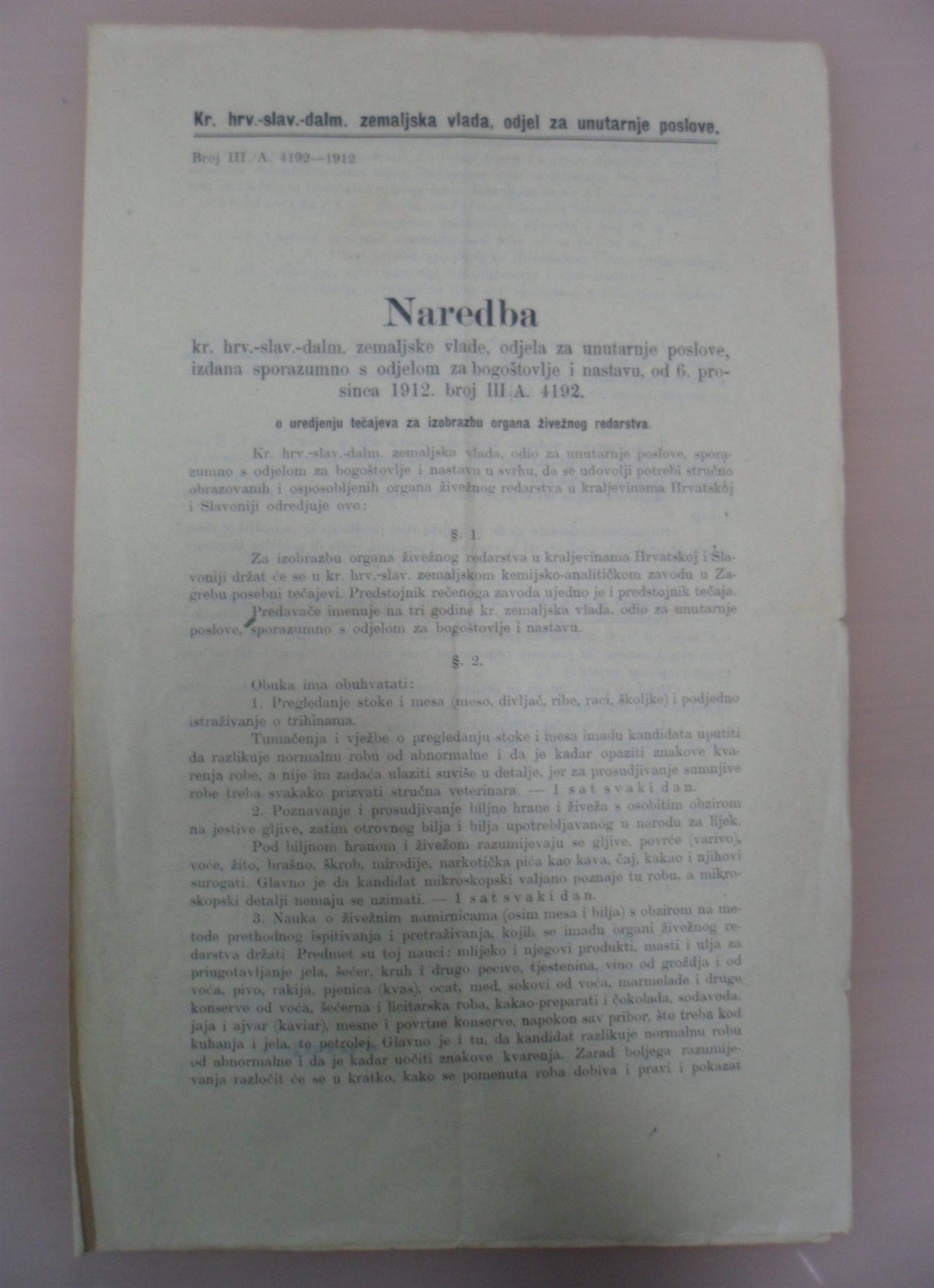 Naredba kojom se ustanovljuju ispitni propisi za one kandidate, koji se žele usposobiti za organe živežnog redarstva